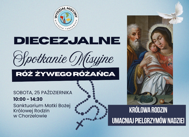 Serdecznie zapraszamy na Diecezjalne Spotkanie Misyjne Róż Żywego Różańca, które w tym roku będzie miało miejsce w Chorzelowie. W Sanktuarium Matki Bożej Królowej Rodzin zgromadzimy się 25 października, czyli w sobotę kończącą Tydzień Misyjny. Będziemy modlić się o wyniesienie na ołtarze Sługi Bożego ks. Jana Czuby, tarnowskiego misjonarza, oraz za rodziny diecezji tarnowskiej, aby […]
